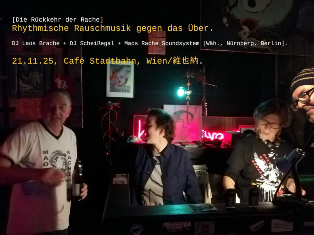 Zum dritten mal auf Einladung des Café Stadtbahn legt Maos Rache Soundsystem in Wien auf, zusammen mit den DJs Laos Brache und Scheißegal. Am Freitag, 21.11.25, 19 – 02 Uhr.